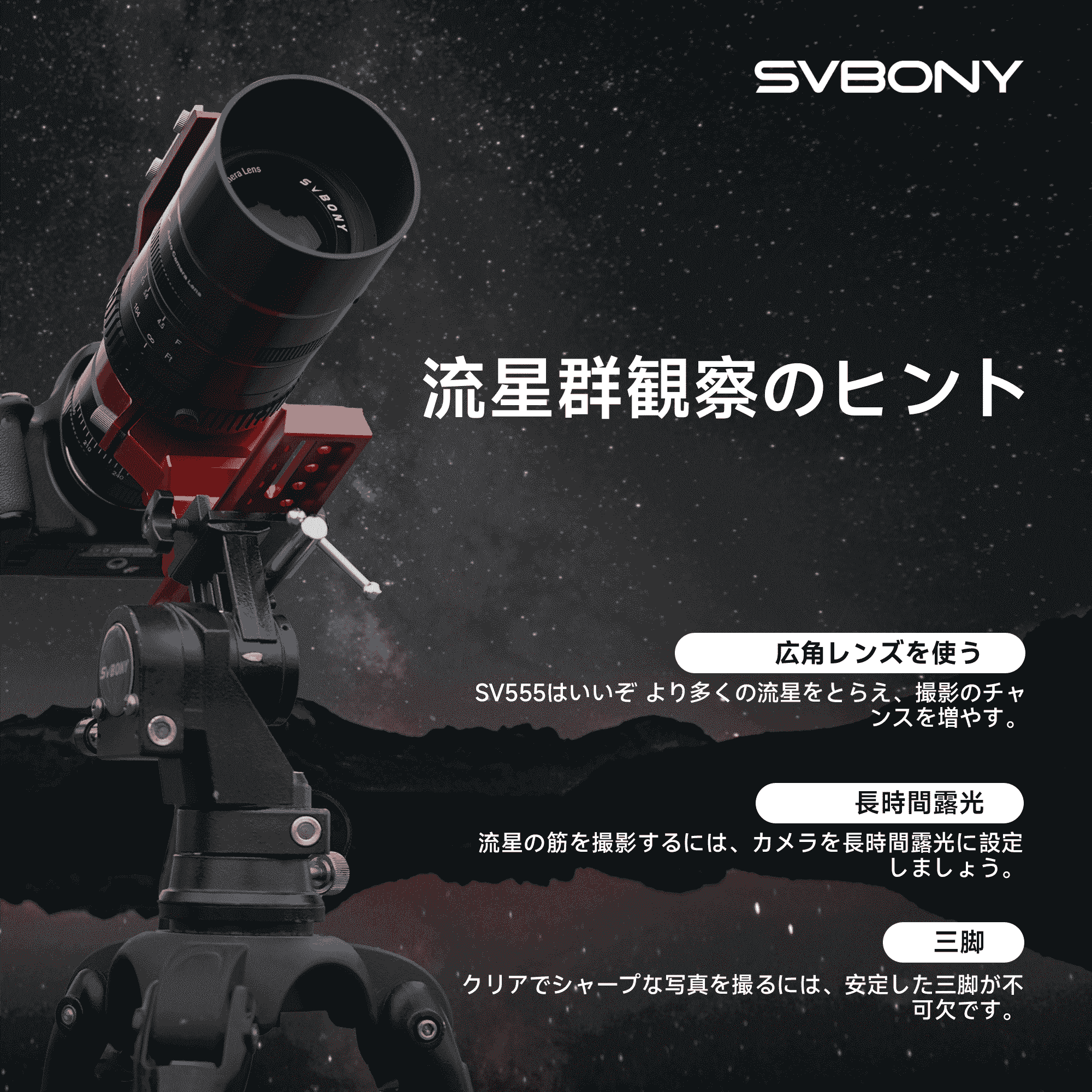 SV555アストログラフは素晴らしい選択です!この鏡筒を使用すると、空のより広い範囲を写すことができるため、流星を撮影するチャンスが増えます。視野が広いほど、より多くの天体の動きを写真に収めることができます。