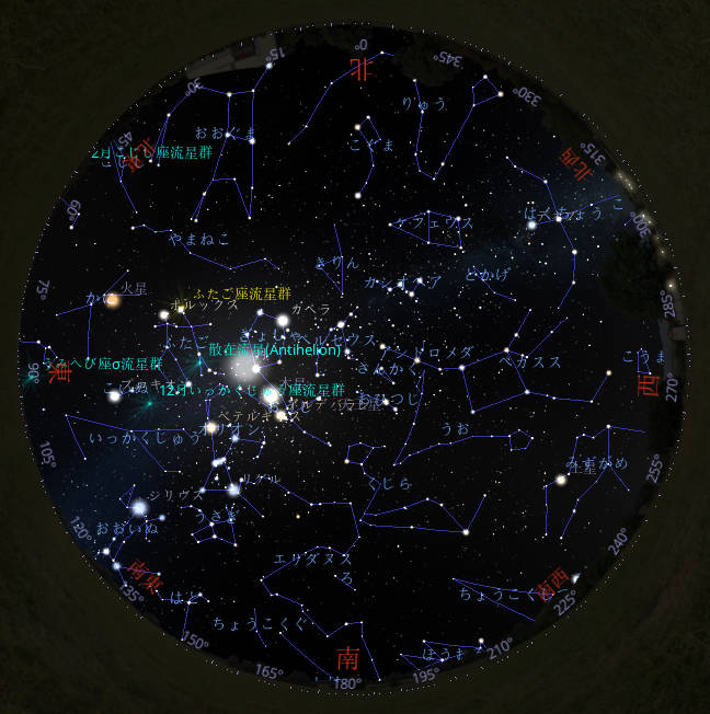 ▪見やすい時間帯:ふたご座にある放射点は、ほぼ一晩中夜空で見えていますので、夕方から明け方まで流れ星を見るチャンスがあります。ただし、夕方の早い時間帯は放射点が低いので、午後9時頃からが好条件となります。深夜の2時頃には、放射点がほぼ天頂に位置するため、流れ星が真上から降ってくるように見られます。ので、午後9時頃からが好条件となります。深夜の2時頃には、放射点がほぼ天頂に位置するため、流れ星が真上から降ってくるように見られます。