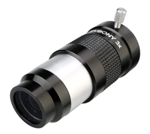 バローレンズは、接眼レンズで使用するレンズです。 バローレンズは、取り付けた接眼レンズの倍率を2倍または3倍にします。 バローレンズを使用するには、接眼部から接眼レンズを取り外し、バローレンズを挿入してから、接眼レンズをバローレンズに接続します。 ただし、バローレンズは低倍率(焦点距離が長い)の接眼レンズで使用するのが最適であることを忘れないでください。 高倍率の接眼レンズと一緒に使用すると、望遠鏡で出せる最高倍率も大きな倍率が得られる場合があります。