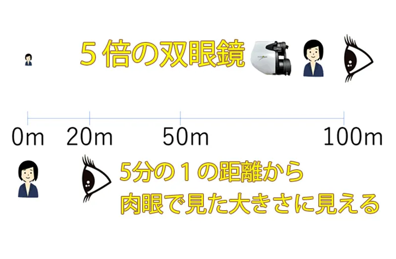 例えば、5倍の双眼鏡は「100m離れた対象を5分の1の距離(20m)のところから肉眼で見た大きさに見える」という意味です。