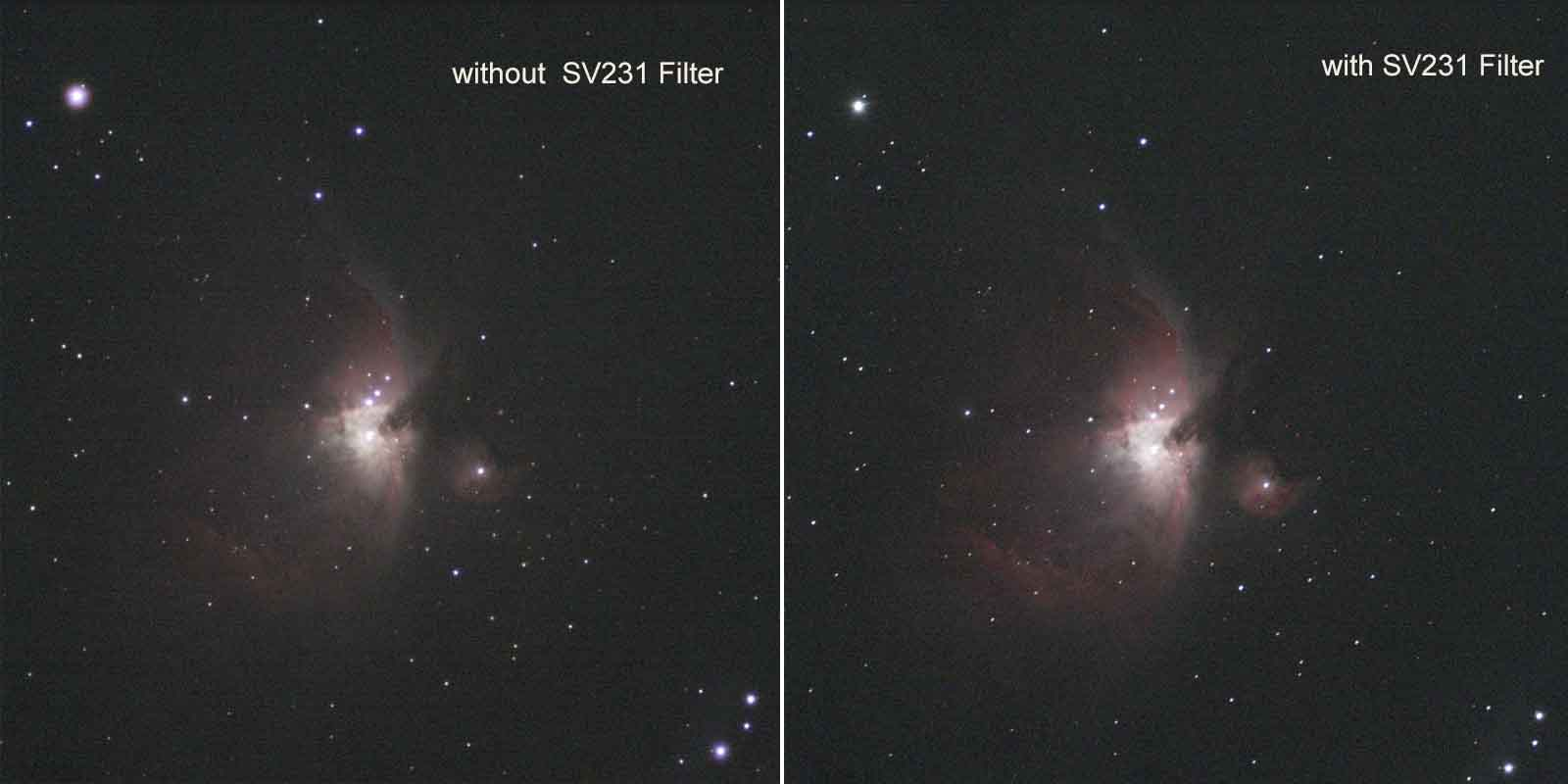 SV231 色補正フィルターは、SV48P や SV503 ED タイプのような望遠鏡を使用する天体写真家にとって、この色補正フィルターはパープル フリンジを効果的に軽減することで、特にオリオン大星雲のような天体の驚異を撮影する際の画像の品質を向上させます。 。