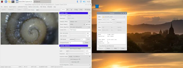 両方の画面を組み込んだスクリーンショット。RaspberryPi用のAstroDMxCaptureのメインプレビューウィンドウと、右側の画面のカメラコントロールを示しています。