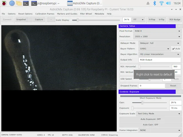 このテストでは、カメラは十分に機能し、SERファイルや長時間の露出をキャプチャするためにも使用されました。晴天の場合に、SV305とRaspberryPiを使用して短時間と長時間の露出の天文画像をテストします。