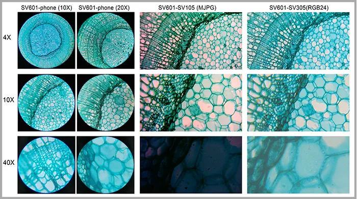 では、顕微鏡でのイメージングに適したSMOSカメラはどれですか? それをより詳しい説明するために、スマートフォンで撮影した写真を追加しました。 この図から、顕微鏡の対物レンズが4倍の場合、SV 105&SV 305 CMOSカメラが植物細胞を見ることができ、特に違いはありません。 顕微鏡の10倍の場合、SV305を使用した画像の色度は、スマートフォンで撮影した画像の色度に近くなります。 顕微鏡を40倍にすると、SV105で画像は比較的暗く、SV305は明イです。