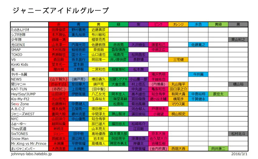 以下はジャニーズアイドルグループのメンバーカラー、一部分の歌手は脱退しましたが、ファンにとうしては記憶でしょう。