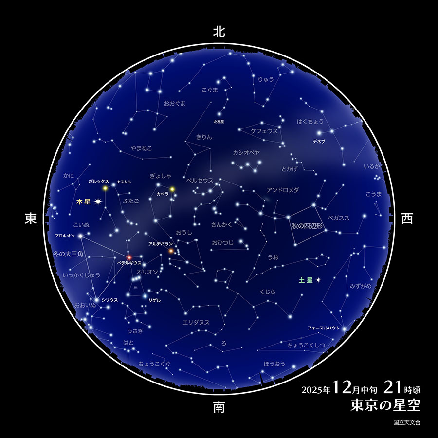 | 12月27日 (土) | 月と土星が接近 | 上弦前の月と、環が細く見える土星が並びます。望遠鏡で環の様子を確認してみましょう。 |