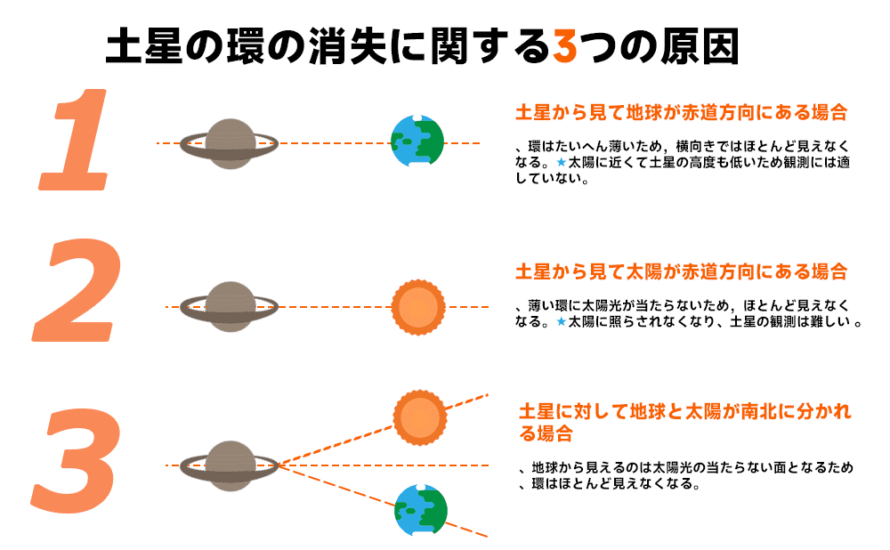 ◦ 条件3. 環の片面が影になる:土星に対して地球と太陽が南北に分かれる場合も,地球から見えるのは太陽光の当たらない面となるため,環はほとんど見えなくなる