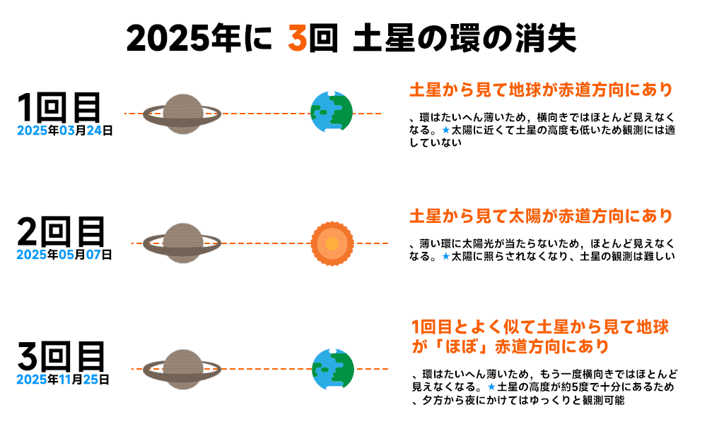 1. 2025年に起こる土星の環の3回を、いつ、なぜ、どのように観測するか