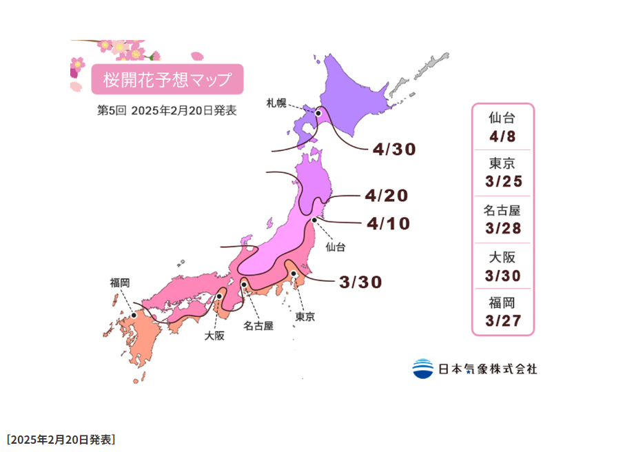 日本気象株式会社は、2025年第5回桜の開花・満開予想を発表しました。以下のスケジュールで進むと予想されます。(2/20)