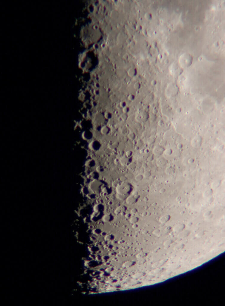 10cm以上の口径の天体望遠鏡(例:SV503 102ED)で詳細な地形を捉えられる