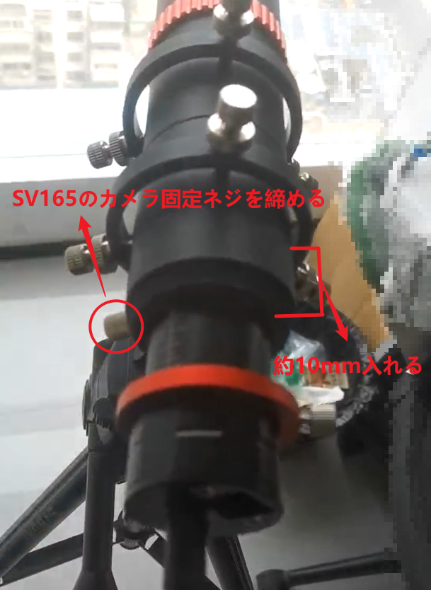 SV905CをSV165ガイドスコープに約10mm離して配置します。 SV165 ガイドスコープの末尾にあるカメラ固定ネジを使用して、SV905C カメラを固定します。