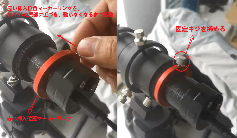 SV905Cの赤い挿入位置マークリングをSV165ガイドスコープの尾部に近づけて動かなくなるまで動かします。次にリングの止めネジを締めます。これにより、次回 SV905C を使用するときに、適切な挿入深さをすばやく見つけやすくなります。