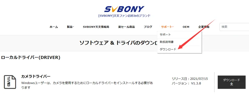 1.PCがSV305を認識するためのドライバーソフトと、実際にカメラから画像を取り込むためのアプリケーションが必要になります。いずれもSVBONYサイトの製品ページからダウンロードすることができます。