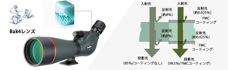- 80mm FMCコーティングの大型対物レンズ。 FMCの完全な多層コーティングが鮮明な画像を得られます