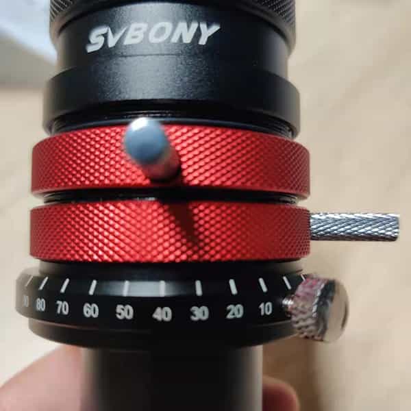 2本のレバーが合わせる位置が補正量0の位置です。アイピースを接続して、二つのレバーを反対側に徐々に回転します。惑星の上下に出ている色にじみが最も小さくなる位置で固定します。
