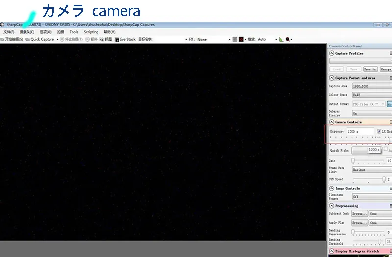 - 6、「SharpCapソフト」のメニュー中の「camera」リストから「SVBONY SV305camera」をクリックし、少しすると画面にデジアイピースで映し出した画面が表示されます。