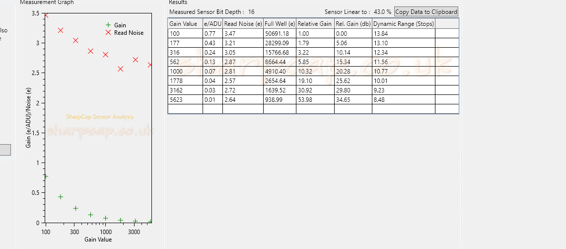(参考訳:「HCGとLCGの読み出しノイズをテストしました。私の見解では結果はいいで、以下がそのテスト結果です。低変換ゲイン(ゲイン100)では、フルウェル容量50,691において、読み出しノイズは約3.47でした。一方、高変換ゲインでは、フルウェル容量14,580において、読み出しノイズは1.25でした。」)