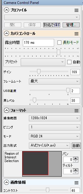 [Colour Space] で、カラー・白黒・ベイヤー配列データが選べます。簡単操作の場合は、カラー(RGB24)か白黒(raw8,raw16,mono16)
