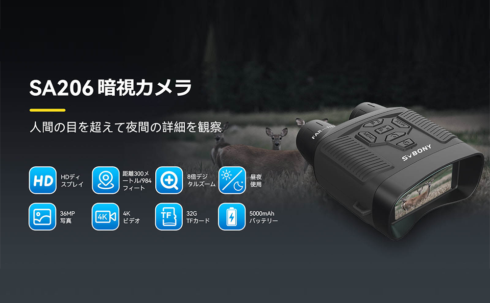 SVBONY SA206 高輝度赤外線暗視カメラは——探検、野生動物の観察、狩猟のいずれの場合でも、双眼暗視装置は最良のパートナーとなります。 3インチ480*800 TFT LCDディスプレイと内蔵高感度センサーを搭載し、4KフルHDビデオ解像度と36メガピクセルの写真を実現できます。表示されるコンテンツがより鮮明で鮮明になります。