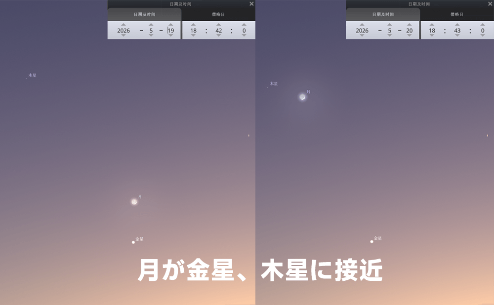 5月20日(水):少し太った月が木星に接近。金星より高い位置で見つけやすい。双眼鏡なら月のクレーターと木星のガリレオ衛星が同時に視野に入るかも。ふたご座のポルックス・カストルも近くに輝きます。