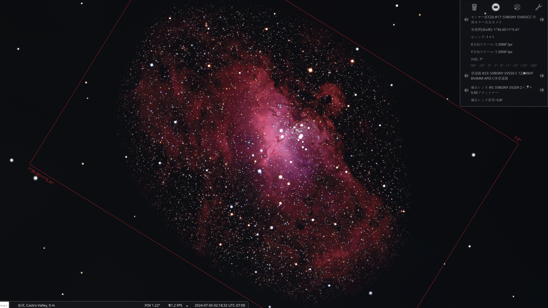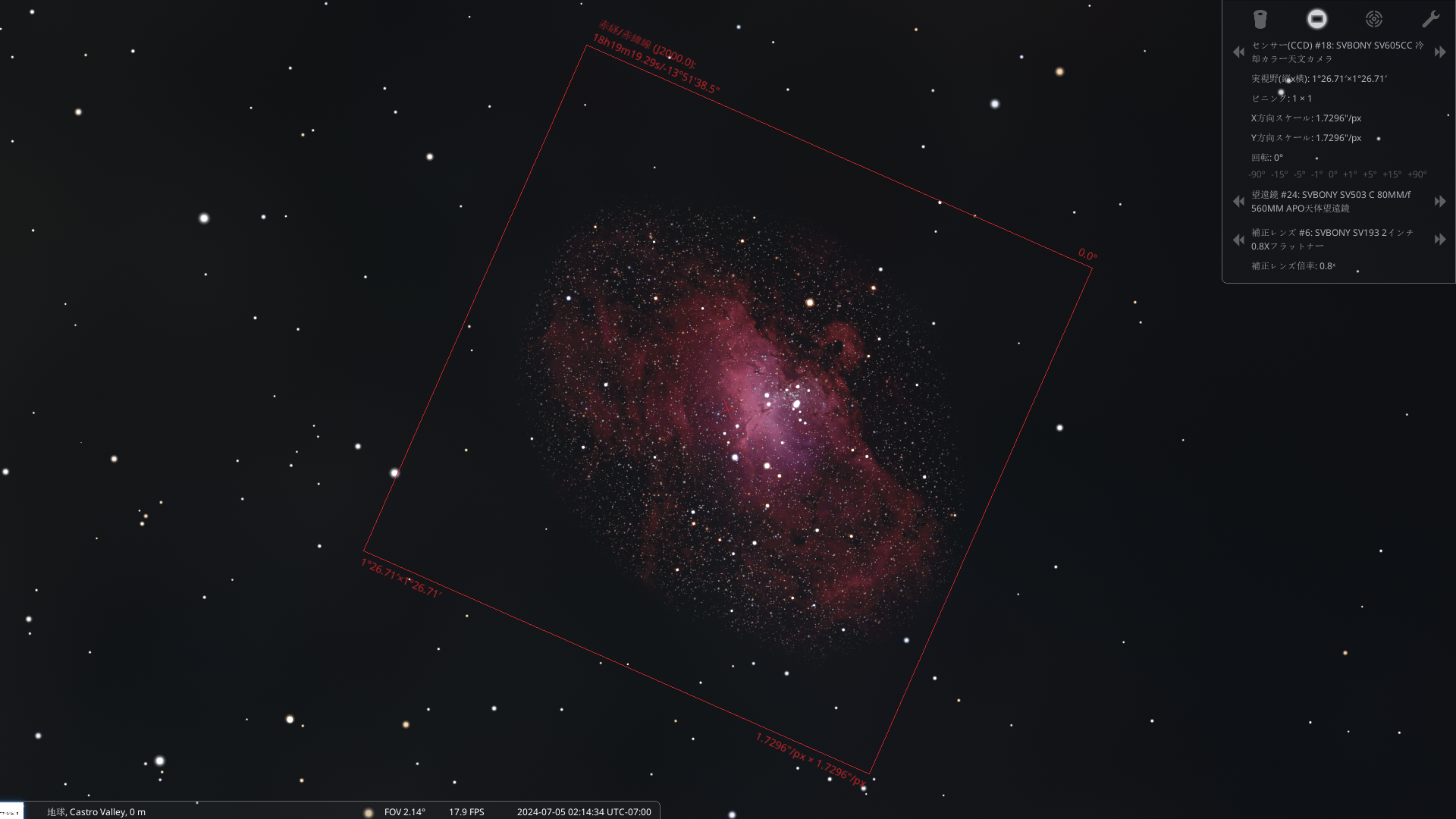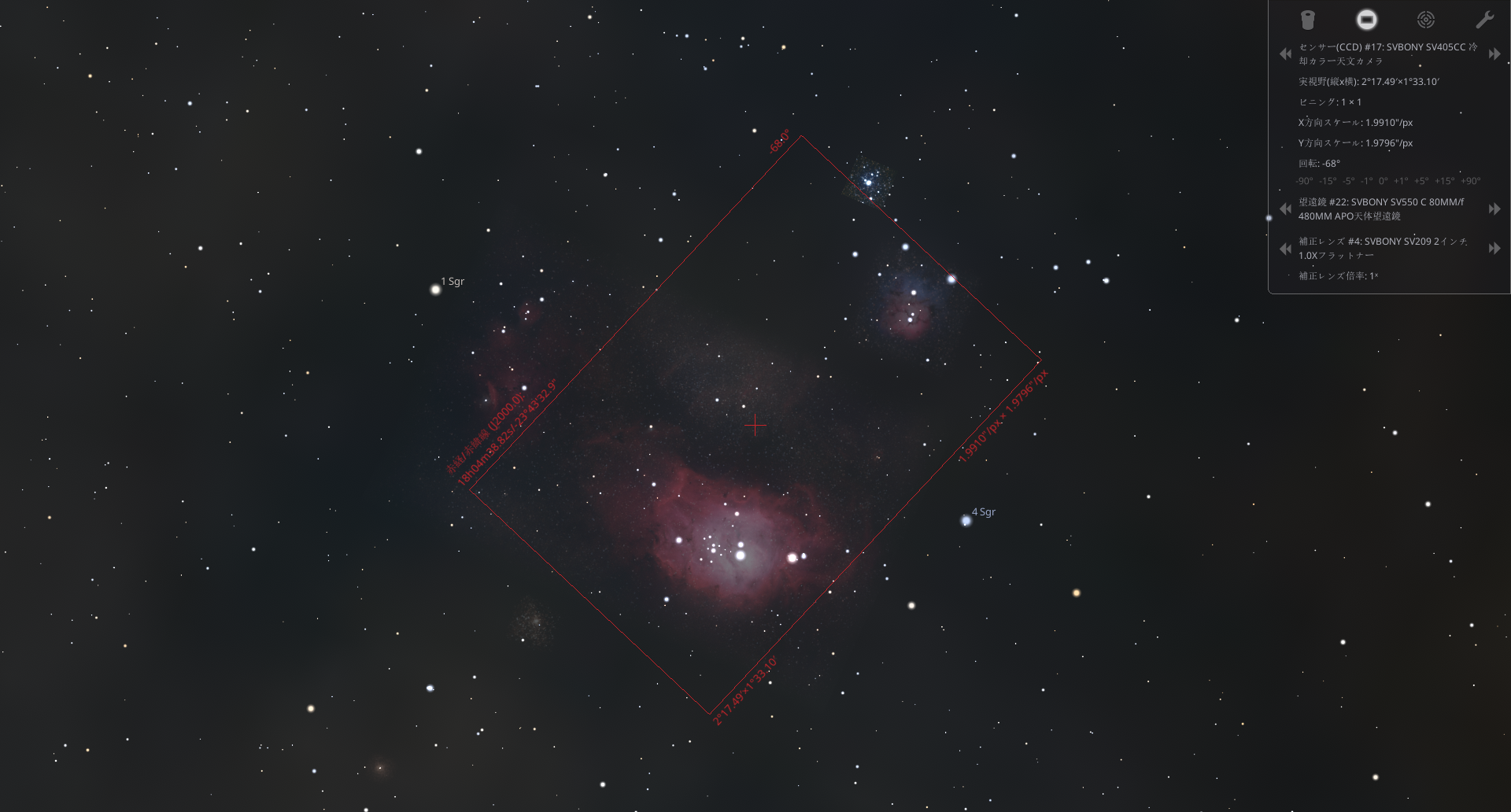 「Stellarium」を使えば、手持ちの機材のパラメーターを入力するだけで、すぐに星雲を見つけ、観測や撮影のシミュレーションができるのでおすすめです。上の写真は、「Stellarium」でシミュレーションした、潟星雲雲と三裂星雲の撮影におすすめの構図です。