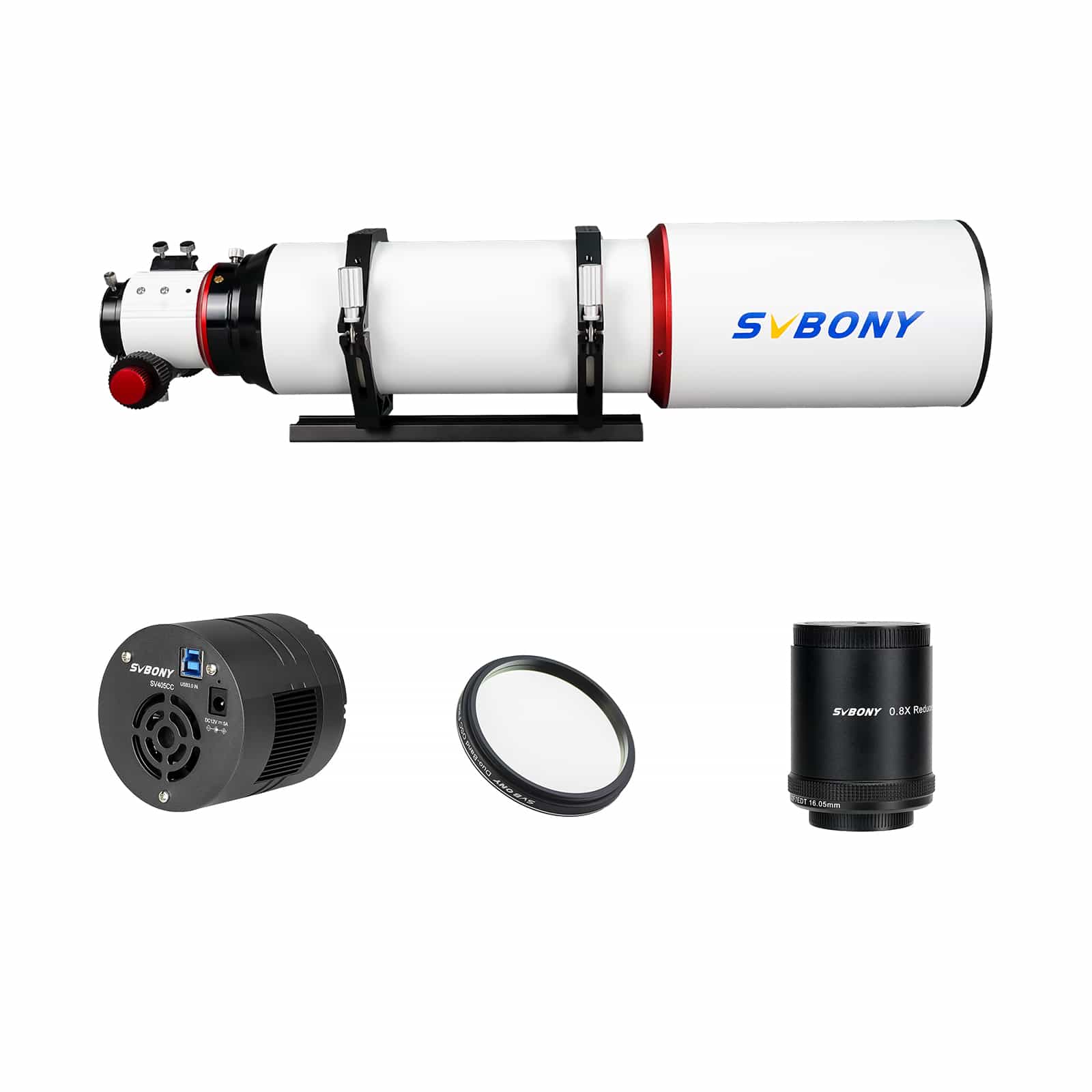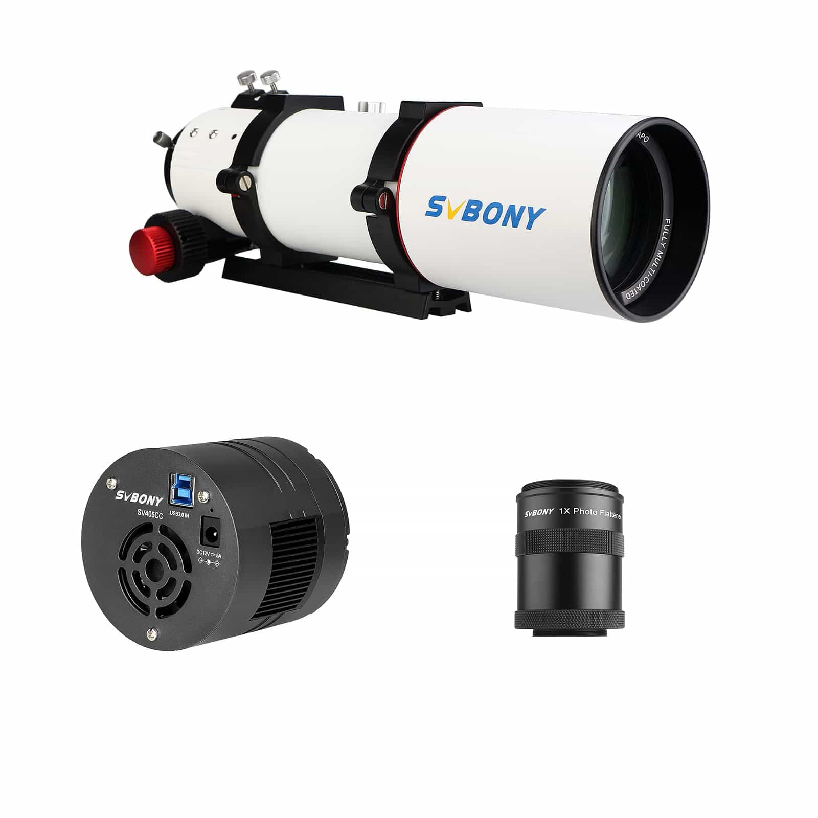 色収差がほとんどない高画質な撮影をお望みの場合は、SVBONY SV550 80MM APO 天体望遠鏡、SVBONY SV209 1.0x フラットナーとSVBONY SV405CC 冷却カラー天体カメラをお勧めします。