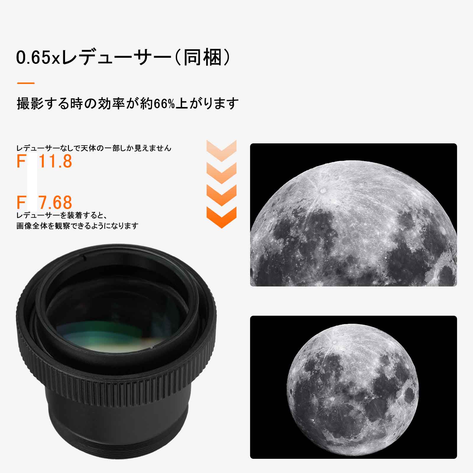 0.65倍レデューサー:0.65倍フラットフィールドレデューサーを使用すれば、焦点比をF7.68に変更するのは可能です。焦点距離は変わりませんが、像を平坦にして周辺像を改善します。構図の自由度が高くなります。銀河や星雲の細部をクリアに描写できます。