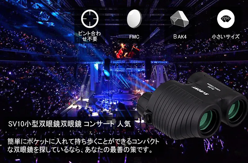 SV10双眼鏡はピント合わせが不要です、手間のかかる調整がいらない、見たい時にサッと取り出し、すぐ見えることができます。重量はわずか225g、軽量でコンパクトで持ち運びは便利です。一つりんごの重さと同じです。