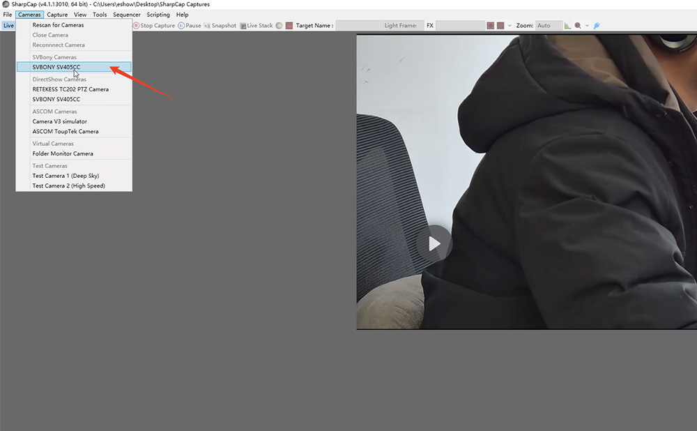 まず、ダウンロードしたshapcapソフトウェアを開き、対応するカメラを選びます。