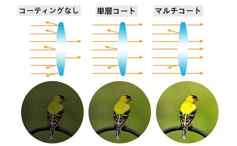 *コートがない場合、レンズの反射率は約4%に達し、光学系の枚数が増えると全体の透過率は低下します。また反射した光はフレアやゴーストを発生させて光学系の性能を低下させます。