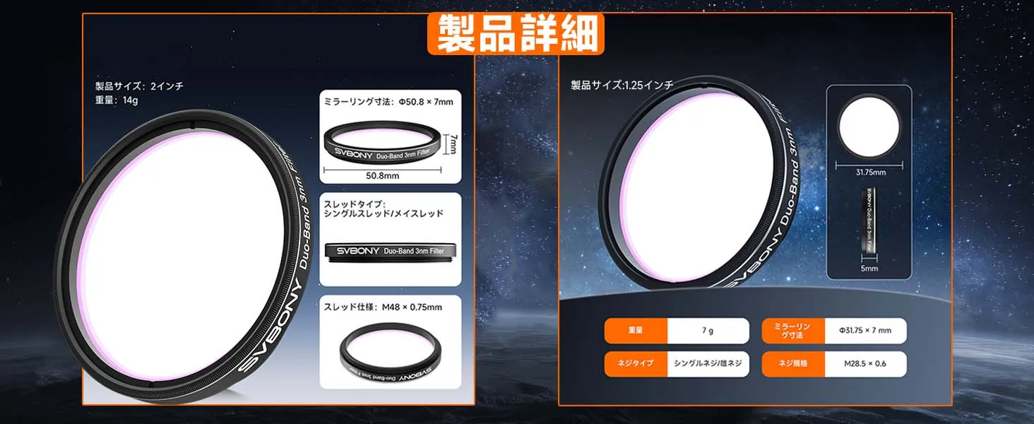 1.25インチ(M28.5×0.6ネジ)と2インチ(M48×0.75ネジ)の2つのサイズがあり、様々な望遠鏡やレンズマウントに対応しています。