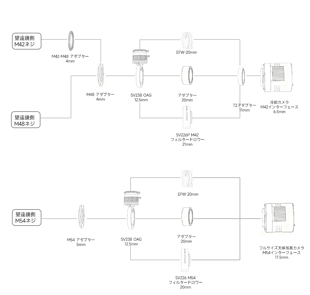 天体望遠鏡の場合は、SV555アストログラフ、SV503シリーズ天体望遠鏡(SV193フラットナー装着)、SV550シリーズ天体望遠鏡(SV209フラットナー装着)、MK105天体望遠鏡(M42アダプター装着)、MK127天体望遠鏡(M42アダプター装着)で使用できます。