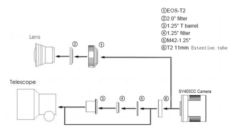 カメラ+T2延長筒+ m42-1.25 "アダプター+1.25 "フィルタ+1.25 " T筒+1.25 "望遠鏡