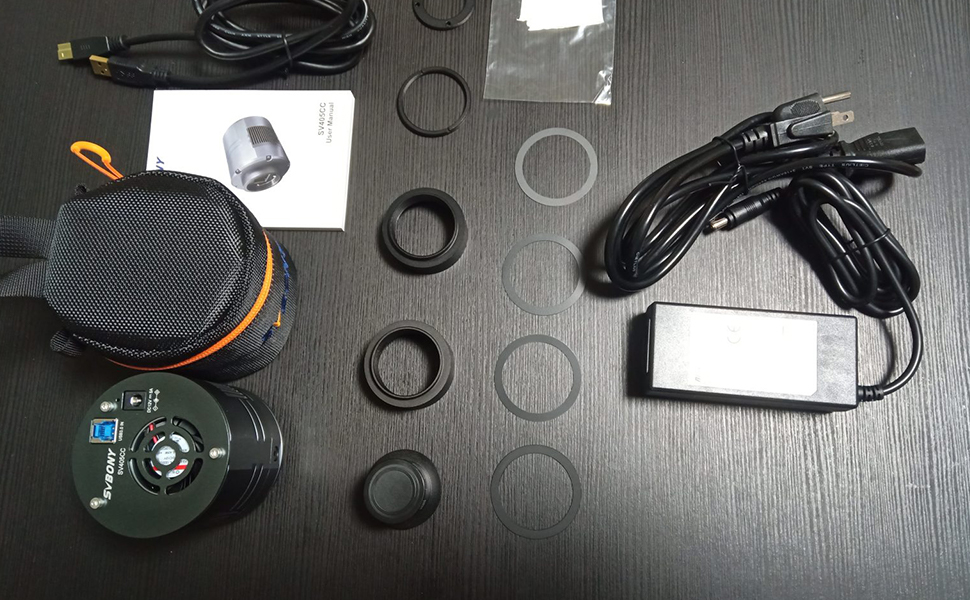 SV405CC を天体望遠鏡に接続するために使用できるアダプターがいくつか付属しています。