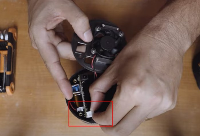 ファンを正しく取り付けたら、電源コネクタを再接続し、カメラ本体の 3 本のネジを取り付けます。すべてがしっかりと固定されていることを再度確認してください。