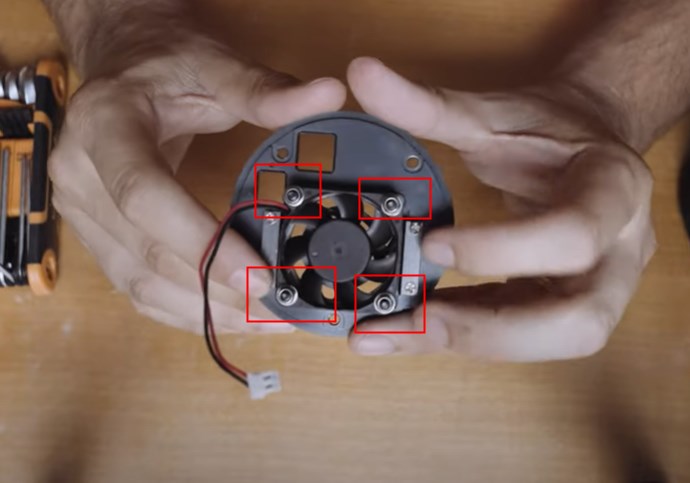 次に、ファンを固定している 4 本のネジを見つけます。これらのネジを外して、後で組み立て直すために安全な場所に保管してください。