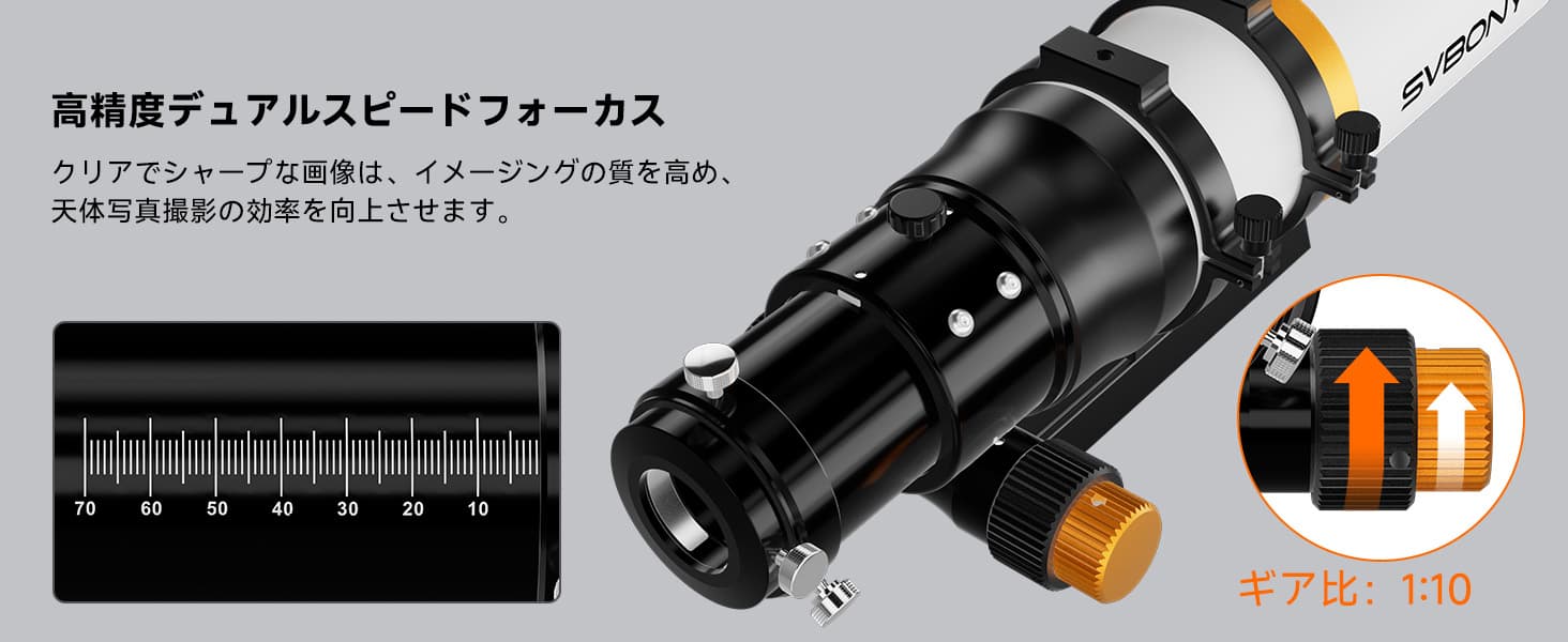 天体写真撮影において、フォーカスの調整は最も重要な作業の一つです。わずかなフォーカスのズレでも、完璧な露出を台無しにする可能性があります。SVBONYはこの望遠鏡にデュアルスピードフォーカサーを搭載しました。粗調整ノブと1:10の微調整ノブの両方を備えています。最大6kgの撮影荷重に対応し、ほとんどの一眼レフカメラ、ミラーレスカメラ、冷却CMOSカメラに対応します。360°回転機構を備えているため、フォーカスを変えずに完璧な構図で撮影できます。フォーカサーには、長時間の撮影でもフォーカスを維持するために不可欠なテンションコントロールとロック機構も内蔵されています。。