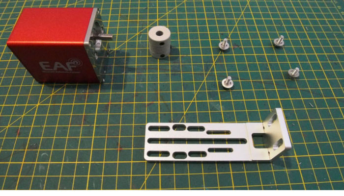 - 1.ZWO EAF のすべての部品が箱に入っていることを確認し (箱の中に何が含まれているかについては ZWO の Web サイトを確認してください)、2x M4 ネジでモーター ブラケットを組み立てます (写真 1)。