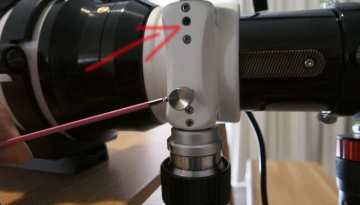 4. フォーカス ロック ネジを取り外します。ただし、穴の中のテンション グラブ ネジに触れたり、取り外したりしないでください (写真 3)。