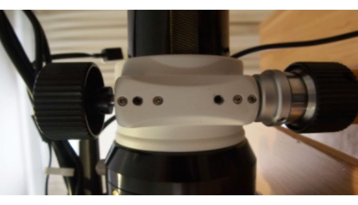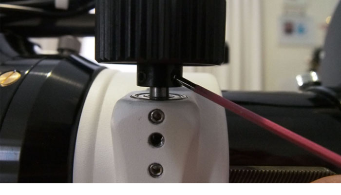 6. ノブを取り外したら、フレキシブル カップル (ZWO EAF ボックスに付属) を取り付けます。どのボア サイズがフォーカサー ノブ シャフトに適合するかを確認する必要がある場合があります。取り付けられたら、グラブ ネジ (2 回締めます) を締めます。 5)