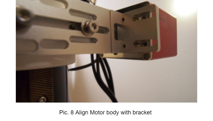 9. 下図のように MOTOR 本体とモーターブラケットの位置を合わせて (写真 8)、M5 ネジ 2 本* + スペーサーを使用してモーターをブラケットに取り付けます (写真 9)