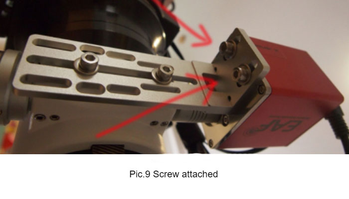 10. モーターブラケットを手で(本体に向かって押しながら)モーター本体に触れる程度に調整し(写真 10)、モーターブラケットのネジを締めます(写真 11)。