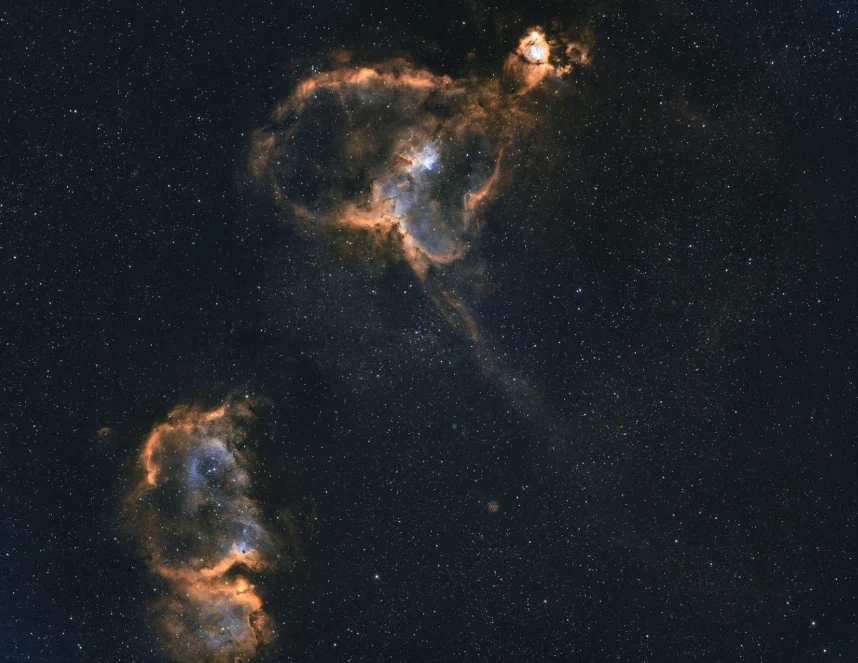 こちらはカシオペヤ座のハート星雲(IC 1805)とソウル星雲(IC 1848)です。実は両星雲を単一フレームに収めたのは今回が初めての経験でした。SV545に備わるカメラ回転機構を活用すれば構図の最適化が可能でしたが、撮影に割ける時間的制約があったため、今回は現状のフレーミングとなりました。