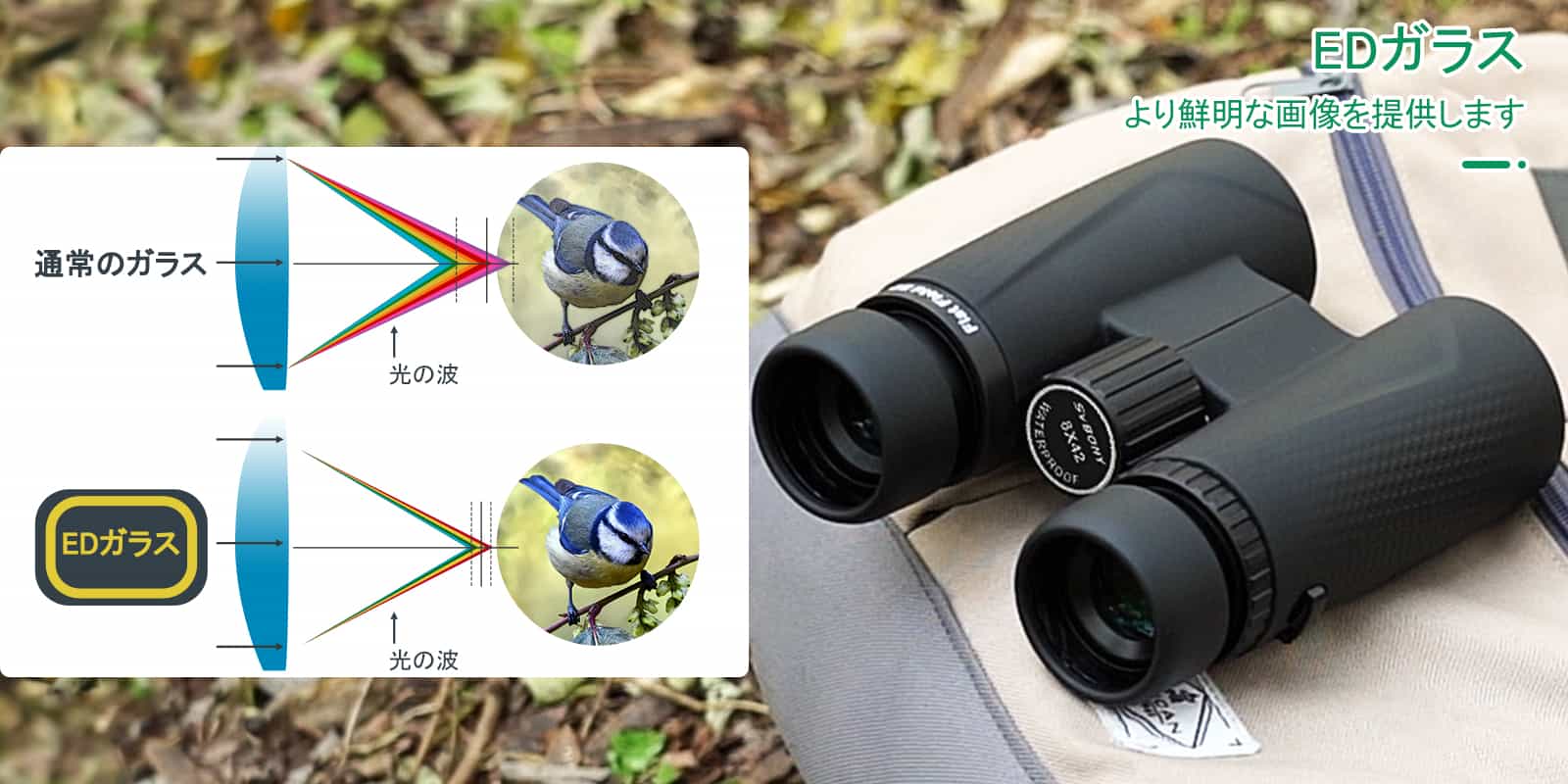 2.ED ガラスは、双眼鏡でよくある視覚上の欠陥である色収差や色にじみを実質的に排除します。 非常に鮮明な画像をお楽しみいただけます。