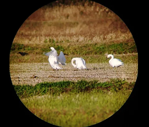 田んぼの白鳥を撮影した作例は、数百メートルの距離です。