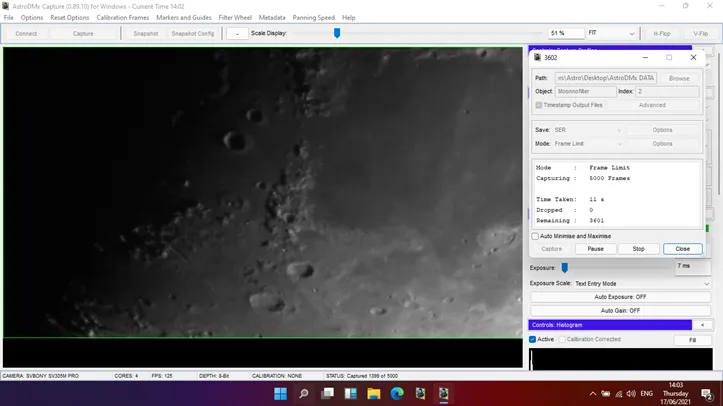 Windows用の「AstroDMx Capture」、月に47%5000フレームSERファイルをキャプチャ