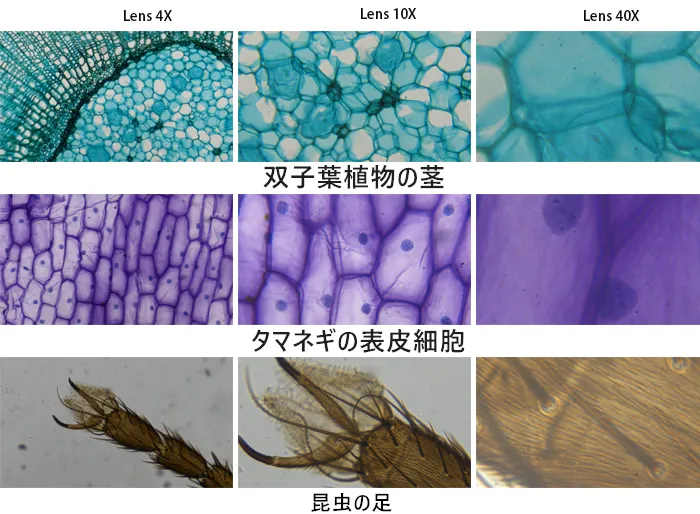 次に、観察対象を見つけ、まず10倍の接眼レンズと4倍の対物レンズを選択します。倍率が低いので、対象を見つけやすいです。次に焦点調整を行います。まず、粗焦点調整して、画像がはっきり次第には微調整をします。
