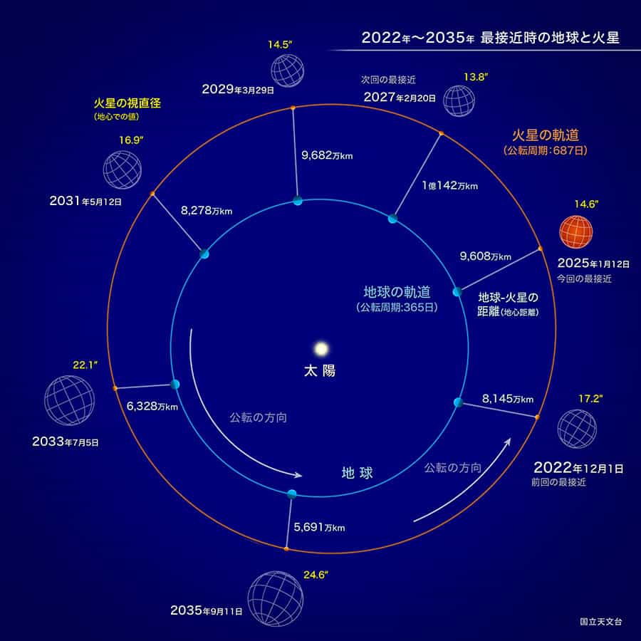 2022年-2035年最接近時の地球と火星 丨 出典:国立天文台