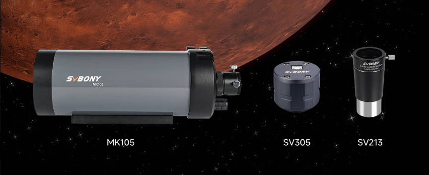 1. 天体望遠鏡を使用する: 天体望遠鏡を使うと、火星の表面の特徴や、惑星の天候パターンや砂嵐のような細部まで 見ることができる。SV305カメラとSV213 3Xバーローレンズ付きのMK105マクストフカセグレン式鏡筒がお勧めです。最高の視界を得るために、必ず焦点を調整してください。