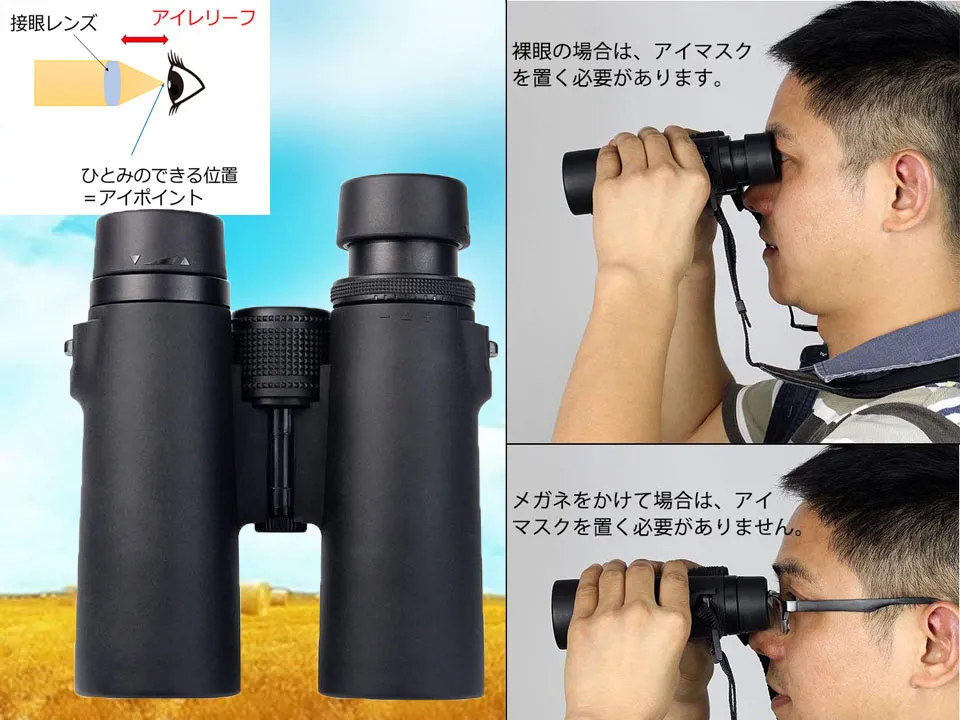 ところが、ロングアイレリーフで見口の高さが不足すると、裸眼で使用する人は見口が顔に触れないため、双眼鏡が不安定になり使いづらくなります。